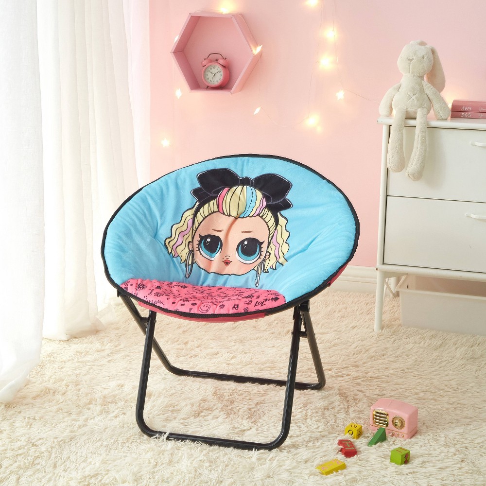 L.O.L. Surprise! Figural Saucer : Give your child their own special place to lounge with this L.O.L. Surprise! Saucer Chair. This saucer chair is perfect to place in the playroom, bedroom or even the family living room. Your child and friends can enjoy watching their favorite television show or sit comfortably while reading a book., This saucer chair is sure to be a favorite with your little one. Its saucer shape makes it the perfect place to cozy up and lounge any time. It's made out of a sturdy metal frame with a polyester-cushioned seat for extra comfort, this saucer chair will stay sturdy and beautiful for years to come. This chair can be folded up for easy storage when it's not in use. This chair set is specially designed to meet high standards of child safety and keeping your child and friends safe. The L.O.L. Surprise! Saucer Chair requires minimal assembly and is easy to clean by wiping down with a damp cloth. Pattern: Fictitious Character.