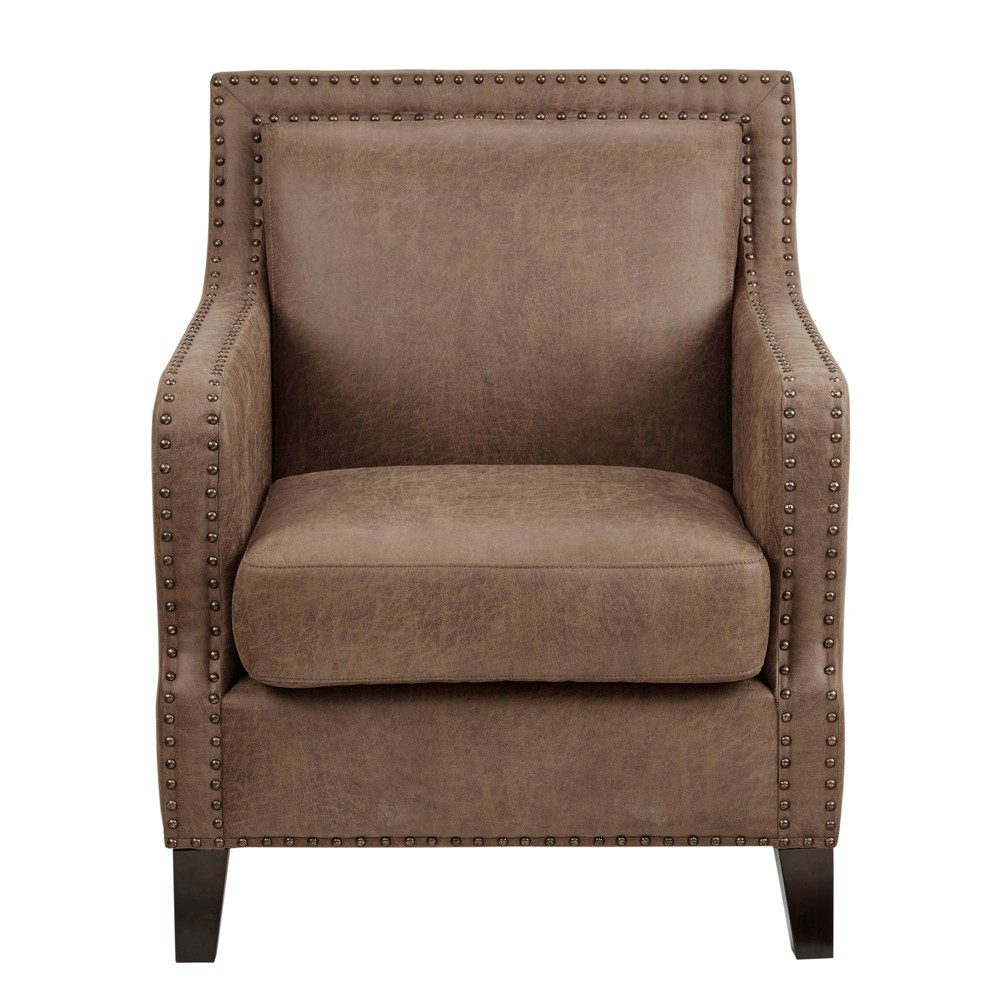 The Shasta Accent Chair introduces a rich and handsome look to your living space. This accent chair is upholstered in faux leather and accented with brass nail buttons, for a stately appeal. The solid hardwood frame and removable foam cushion provide exceptional support and comfort, making it perfect to relax in. A Morocco wood finish on the straight legs complements the brown faux leather to complete the look. Place this accent chair in your living room or home office to give it a sharp sense of style. Leg assembly is required. Max weight capacity 300 lbs.