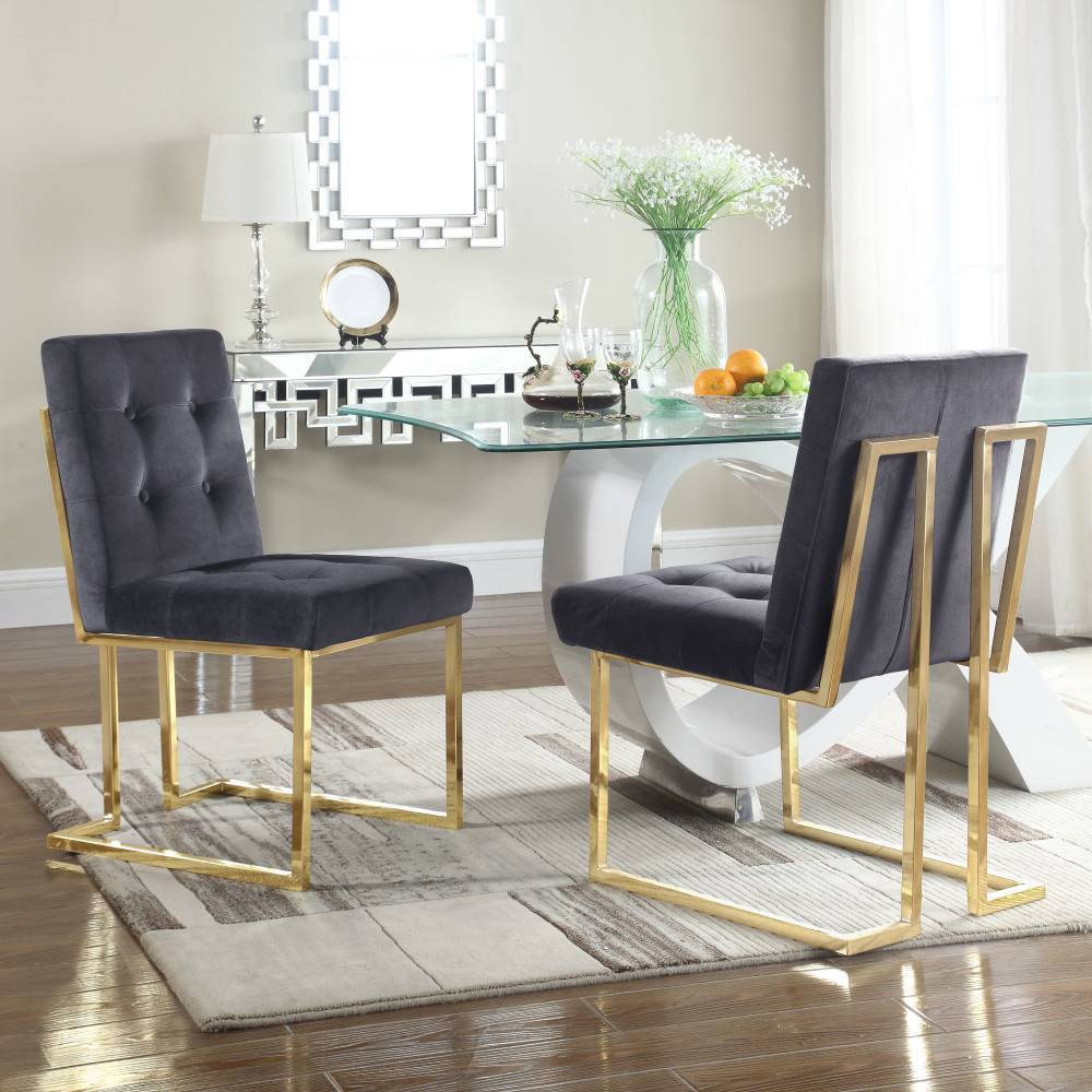Architectural lines define the unobtrusive, yet statement - making dining chair. A gently quilted plush velvet back sits inside a sleek metal frame, finshed in elegant, polished brass. As much a piece of art as a dining or side chair. Pattern: Solid.